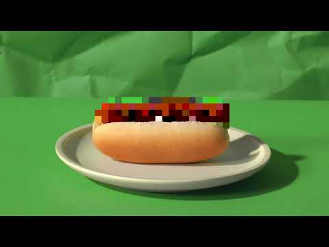 Pixelated Meat: The video begins with a hot dog (or sausage) being placed in a bun, but the meat itself is "censored" with heavy pixelation [00:01].