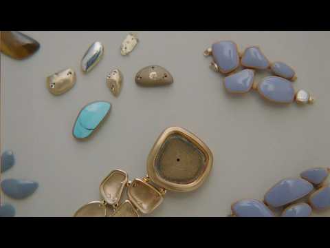 The video highlights the organic shapes, textures, and fluidity of the stones that inspired the bracelet’s design — each link crafted as a singular piece of stone or gold, connected by small golden spheres to create a soft, natural movement.