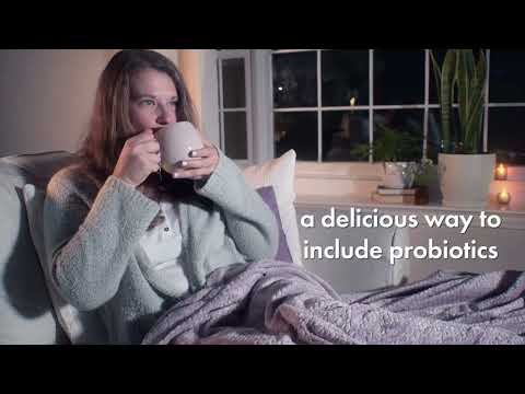 Comfort and Wellness: A woman is shown relaxing on a sofa under a blanket, enjoying a mug of the tea [00:03]. The text describes it as a "delicious way to include probiotics in your daily routine" [00:03, 00:05].