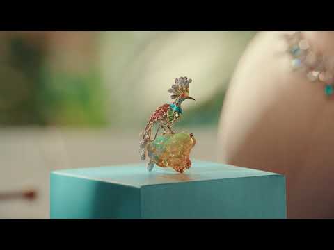 • Fantasy birds rendered in fire opal, chalcedony, sapphires