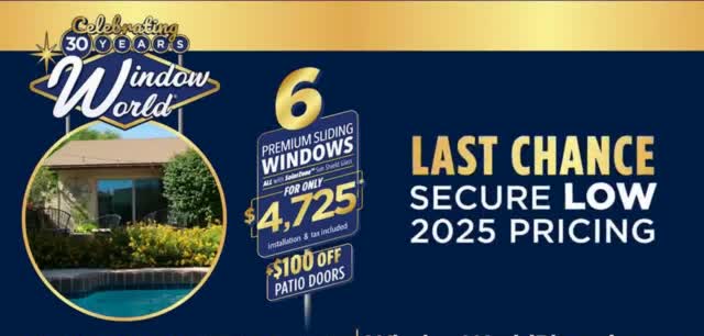 VIDEO Window World 'Complimentary Noise Reduction Upgrade' TV commercial 2025 • Window World TV Spot, 'Complimentary Noise Reduction Upgrade' Check out Window World's TV commercial, 'Complimentary Noise Reduction Upgrade' from the Housing & Home Improvement industry. Keep an eye on this page to learn about the songs, characters, and celebrities appearing in this TV commercial. Phone 602-833-2304- advertisement spot 2025